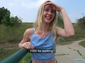 Chubby blonde slut with big black monster tits convinced to fuck in the street in a van