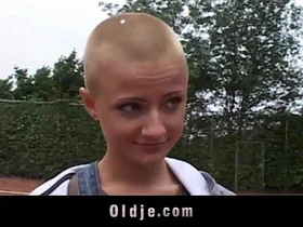 Teen skinny blond gets lot of fun with hardcore interracial anal sex and likes it very much with facial and bald cock cum-shot.